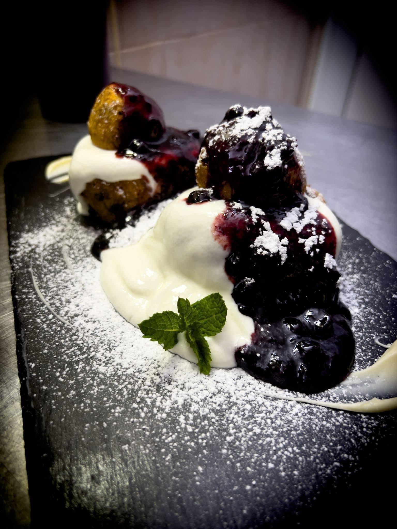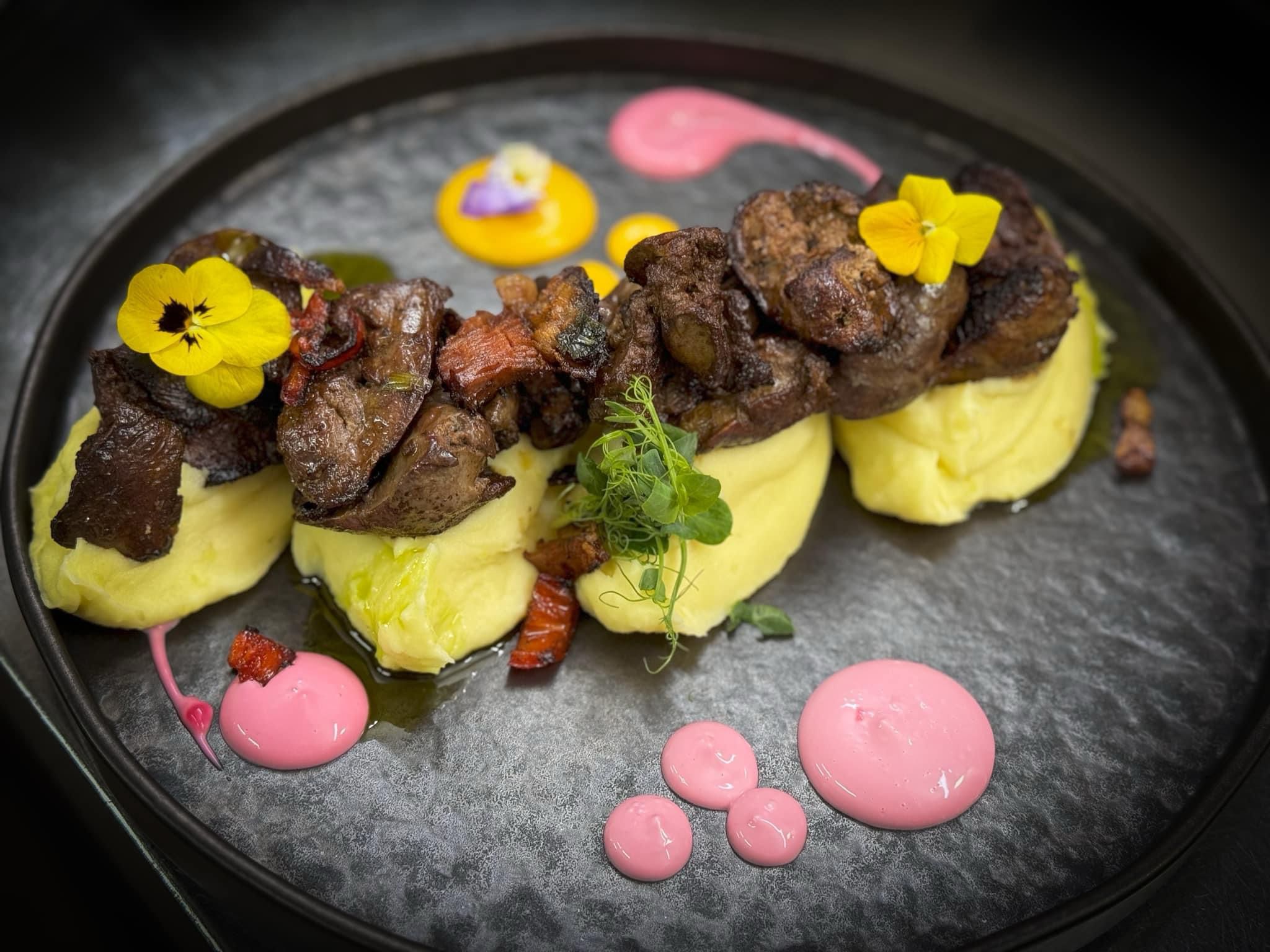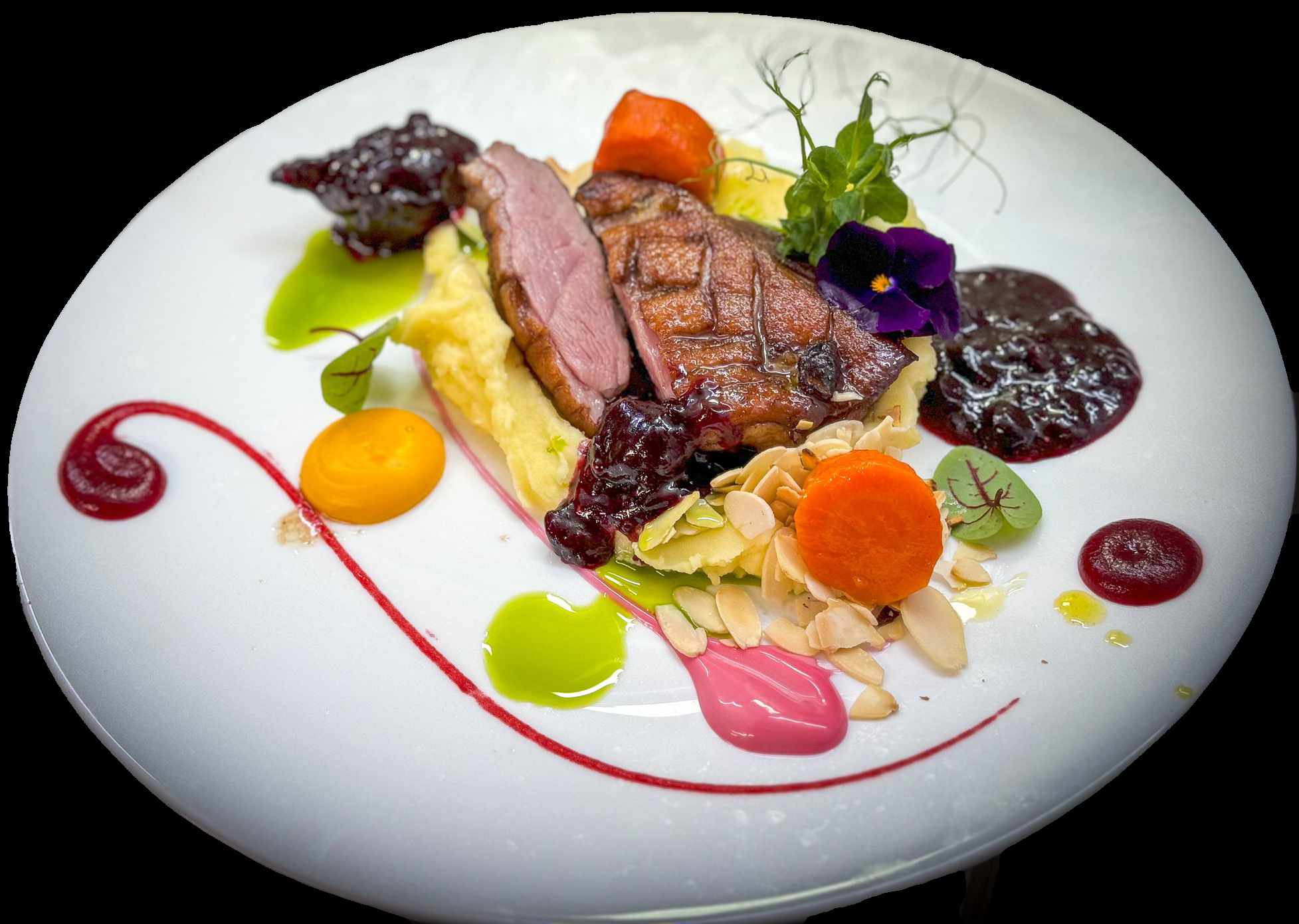 Piept de rata, cartofi piure, sos de fructe de padure, smochine, condimente, fulgi migdale