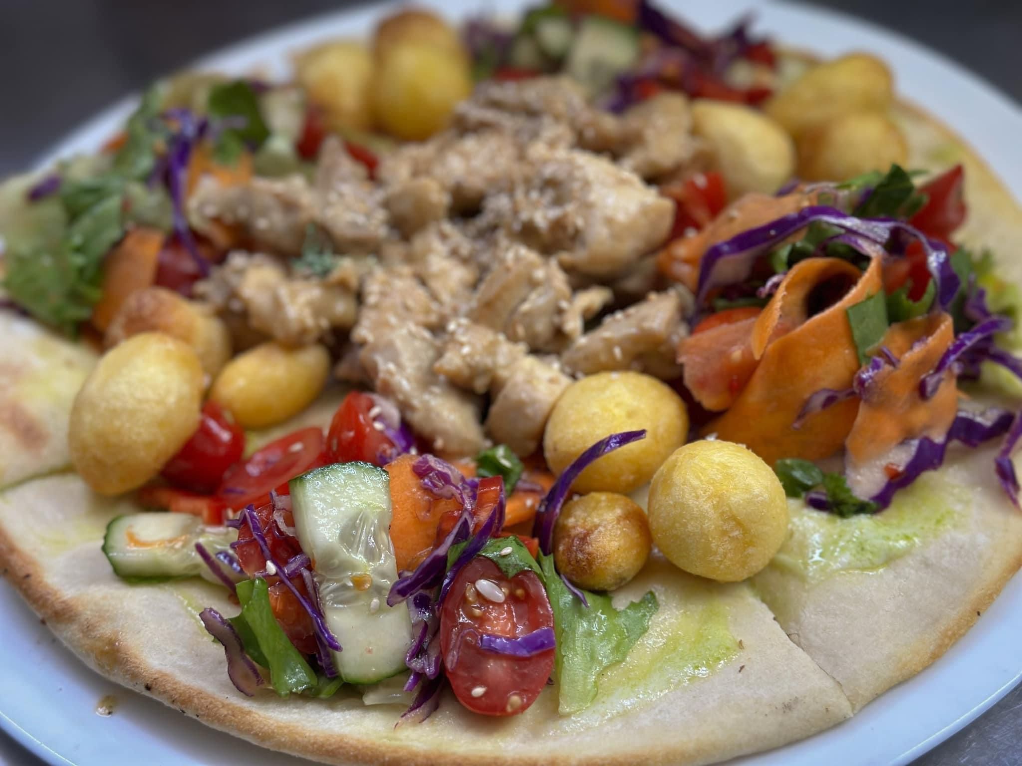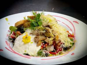 Piept de pui, mix de salata, rosii, castraveti, masline, crutoane (contine gluten), dressing (sos grecesc)
