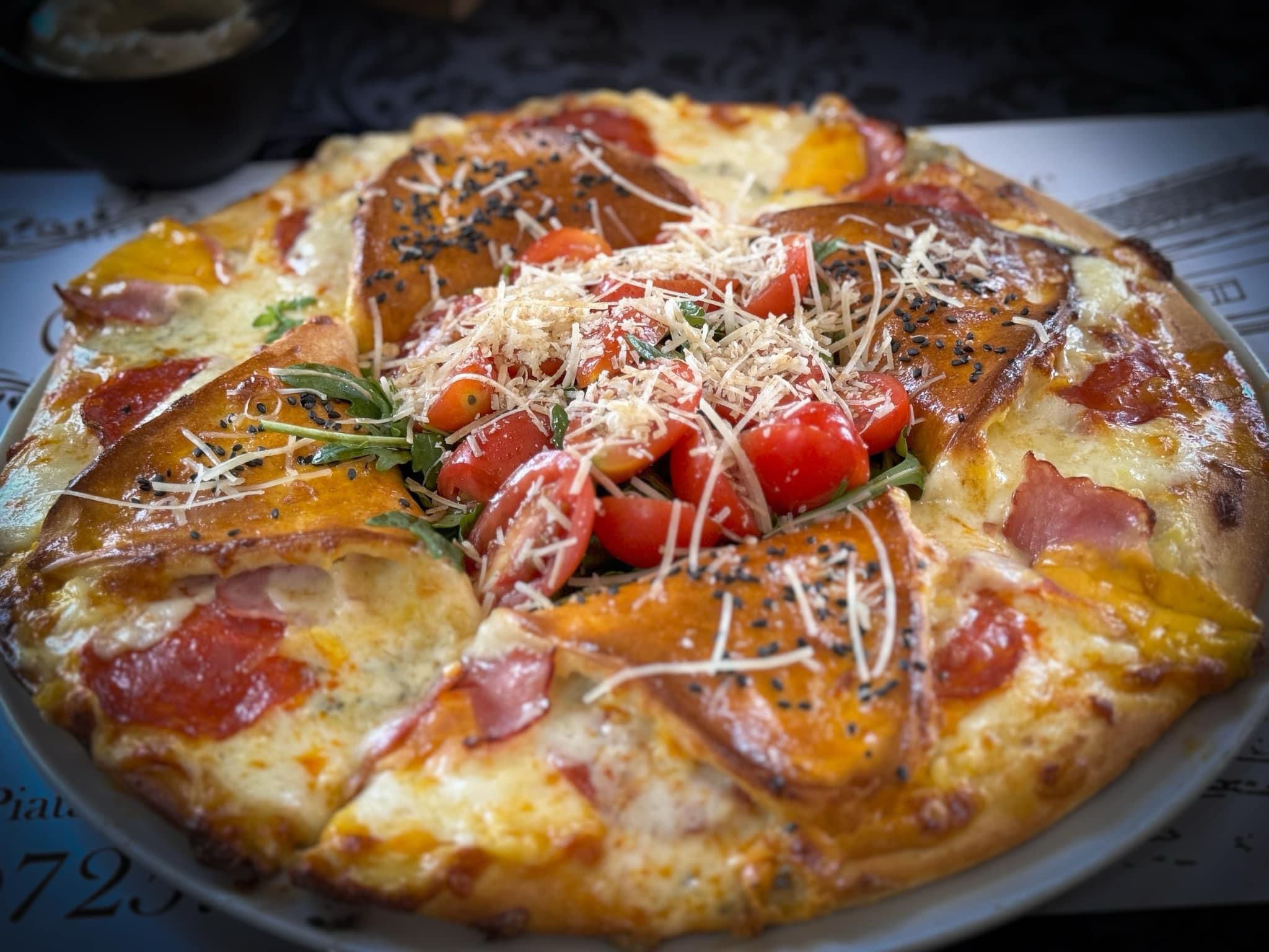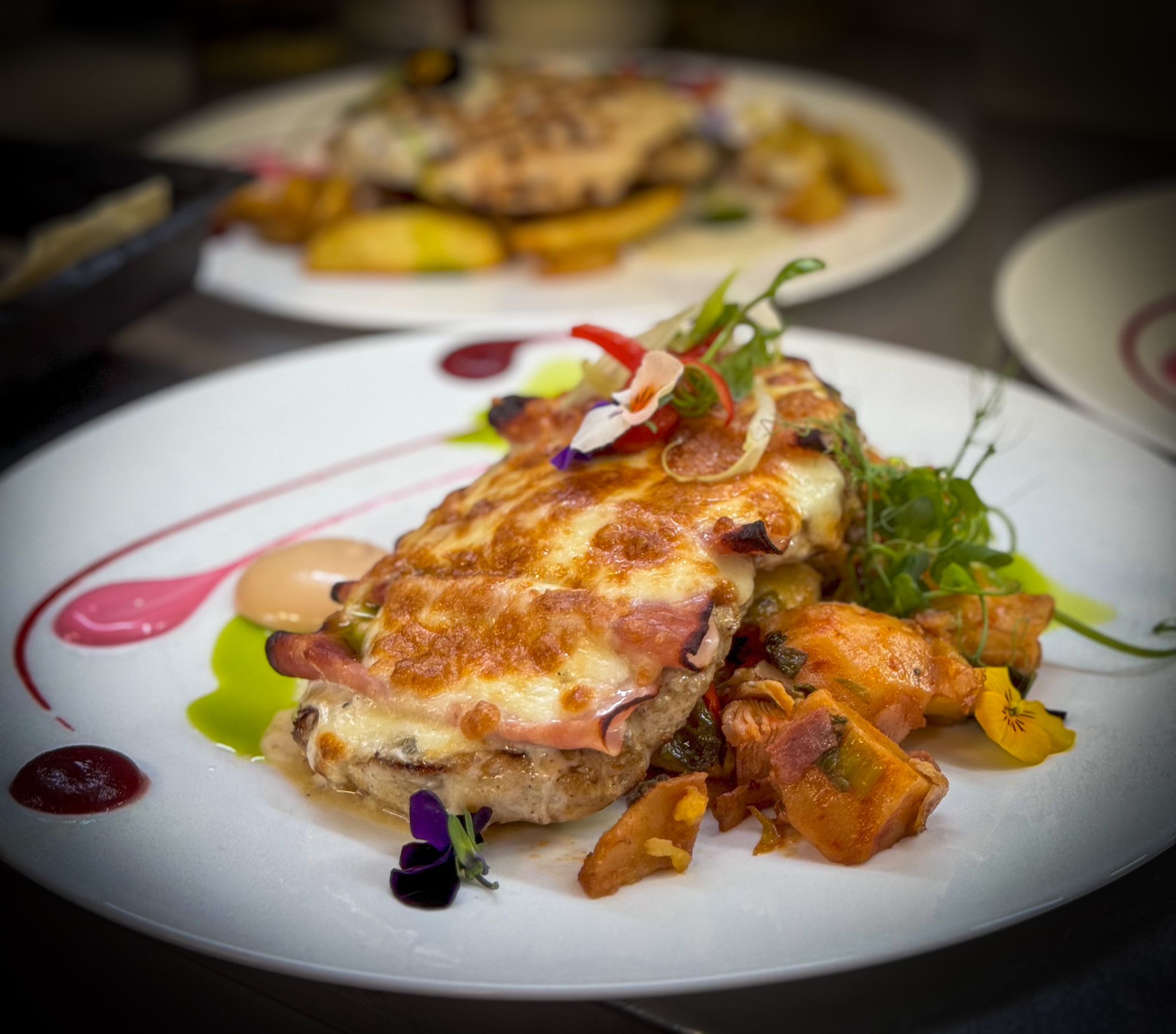 Cotlet de porc, sunca, ciuperci, grancucina, mozzarella, condimente, cartofi taranesti/ pai