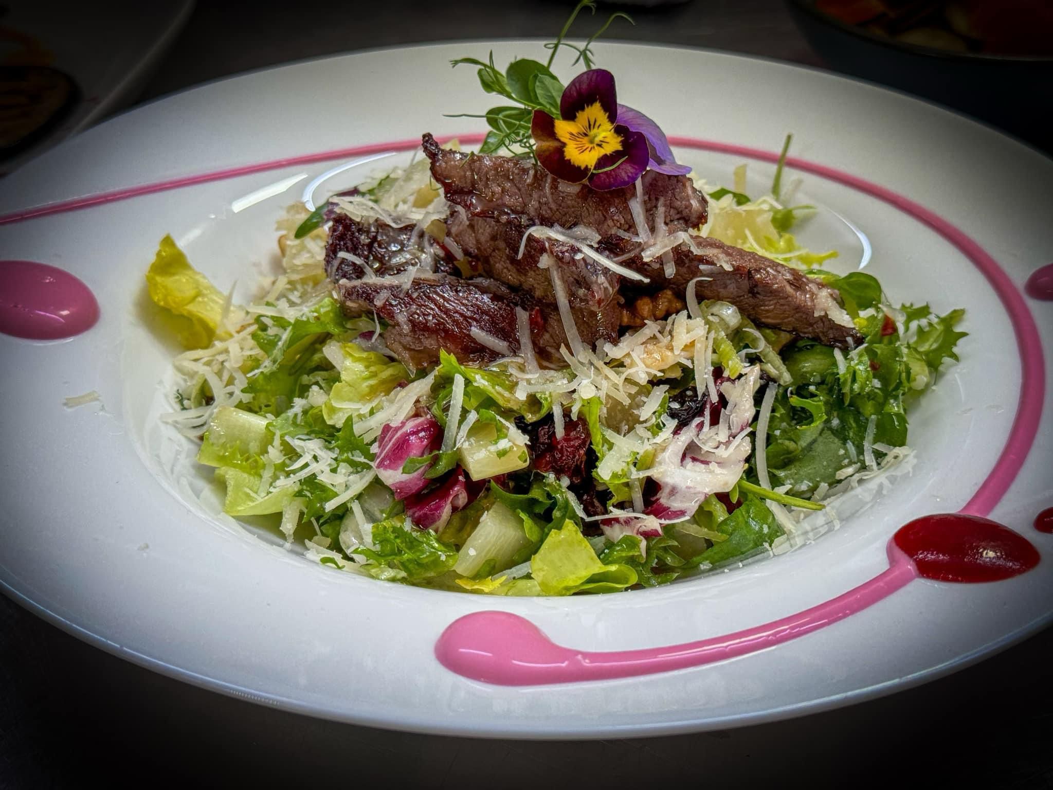 Piept de pui, salata mixta, rosii cherry, grana padano, masline negre, crutoane (contine gluten), dressing Caesar