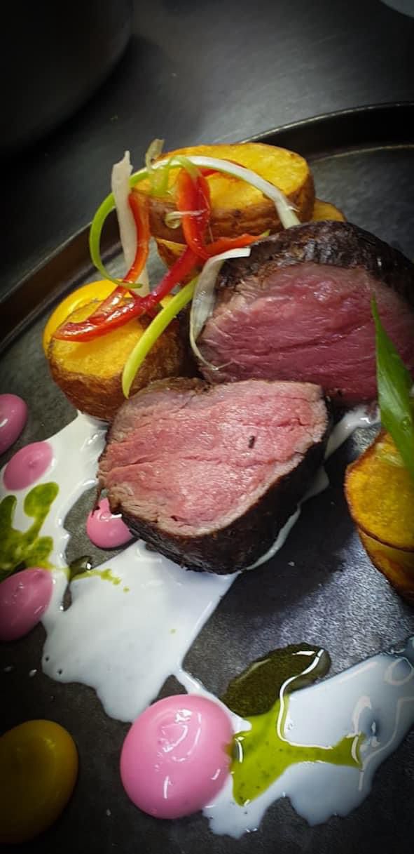 Muschi de porc, cartofi aurii, sos demiglace, condimente, fulgi migdale