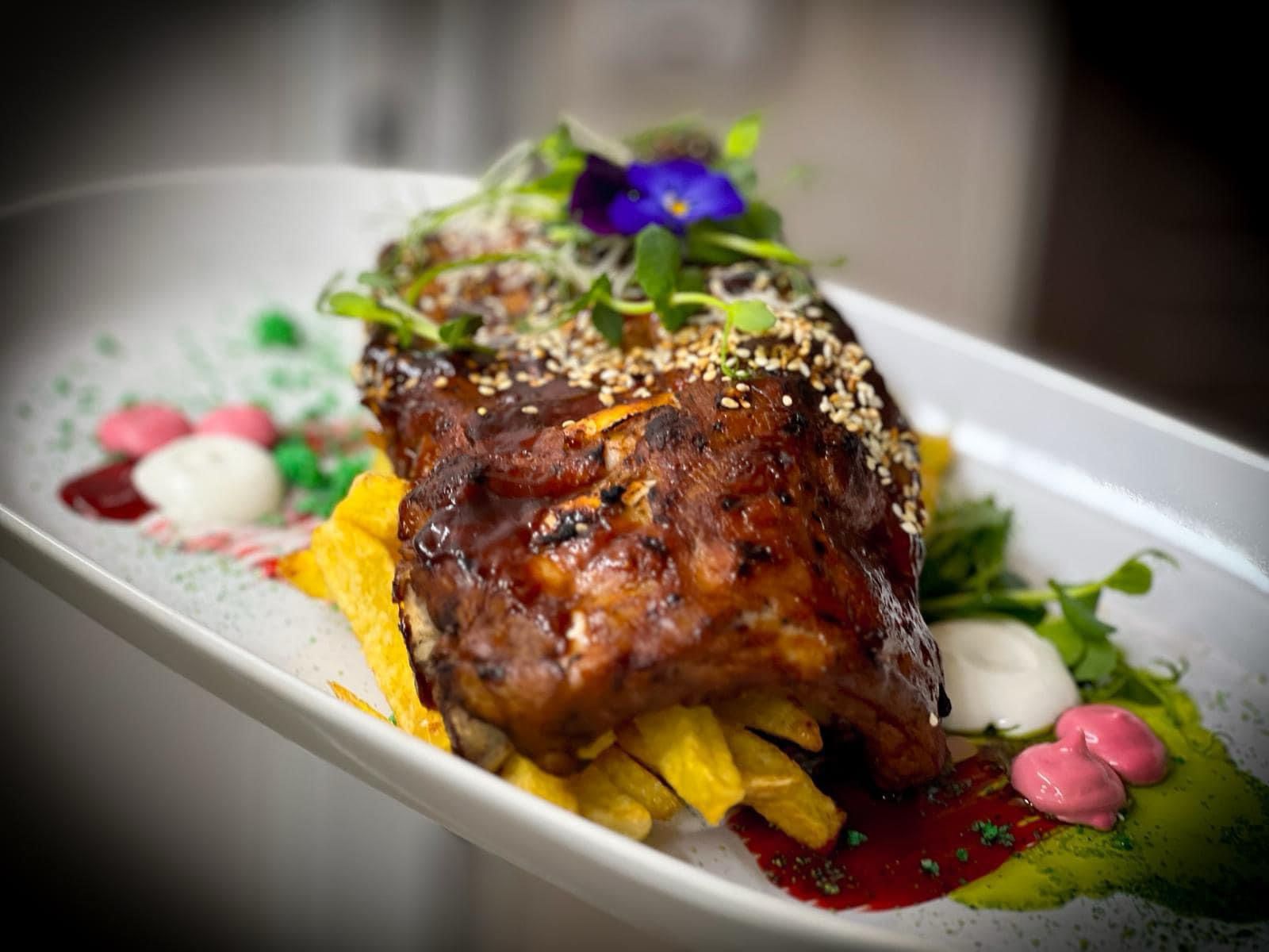 Coaste de porc (400 gr), sos barbeque, condimente, cartofi pai/aurii, muraturi