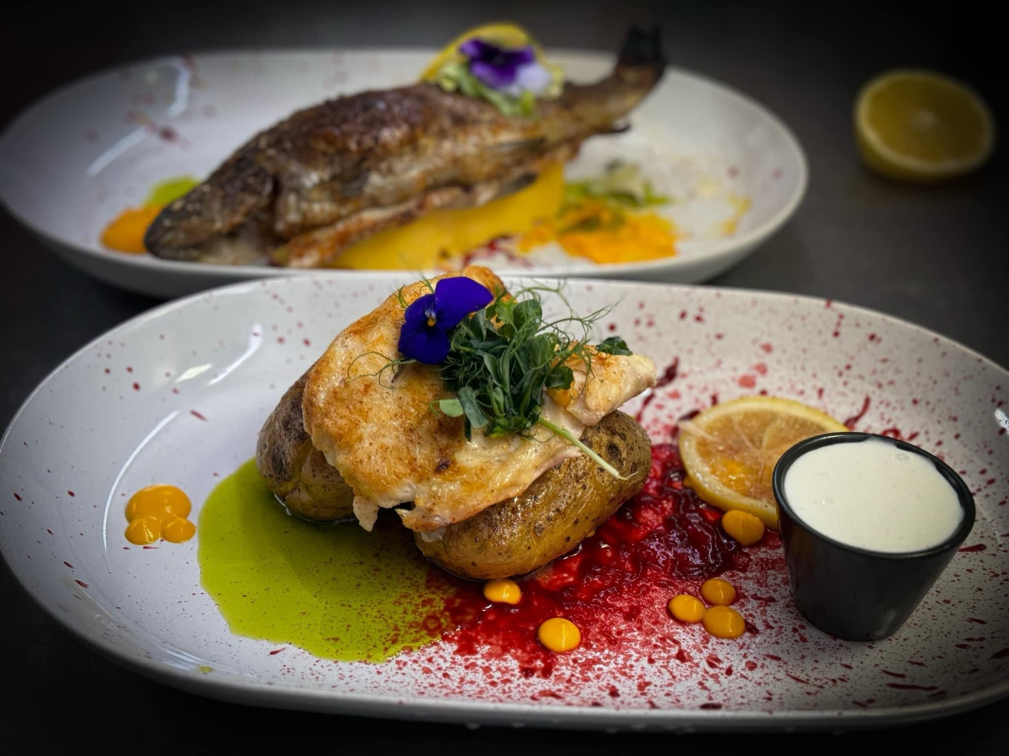 Piept de curcan, cartofi piure, sos de fructe de padure, condimente, fulgi migdale,
